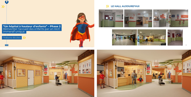 - Des fresques transforment les murs en pages d’un livre. Des petits super héros incarnent les petits patients de Bicêtre et les guident à travers des univers narratifs différents à chaque étage